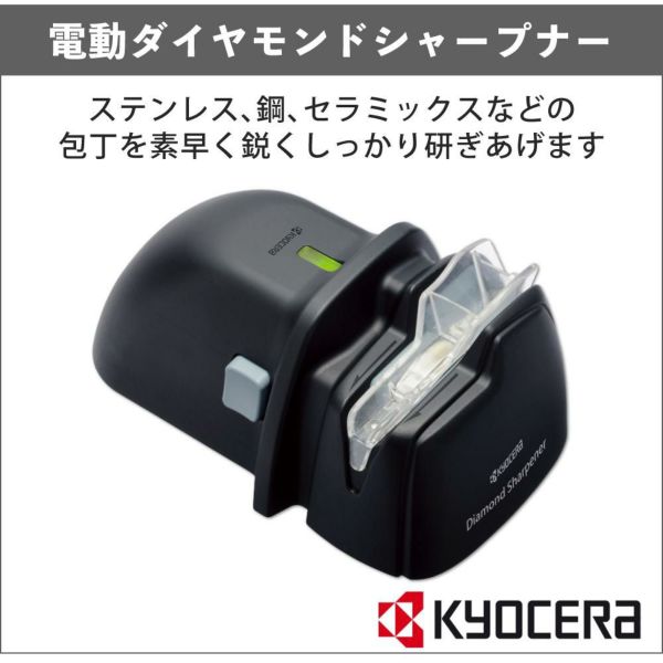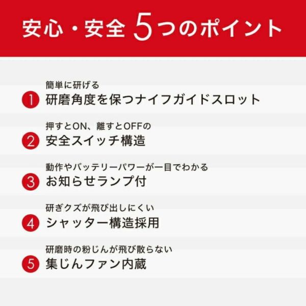 電動パワーとダイヤモンド砥石で、ステンレス、鋼、セラミックスなどの包丁を素早く鋭くしっかり研ぎあげます。 簡単に研げるよう研磨角度を一定に保つガイドスロット付き。 押すとON、離すとOFFの安全スイッチ構造、動作やバッテリーパワーが一目でわかるお知らせランプ付き。 研ぎクズが飛び出しにくいシャッター構造で、粉じんが飛び散らない集じんファンも内蔵されています。