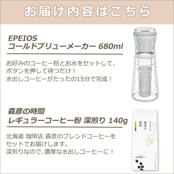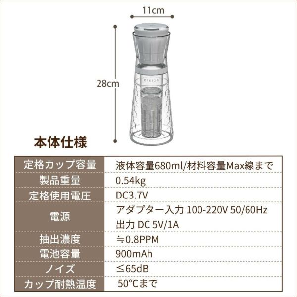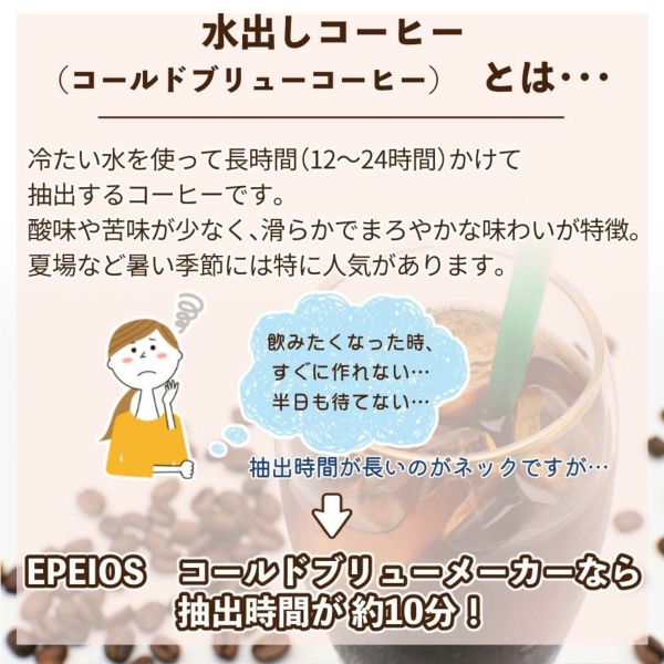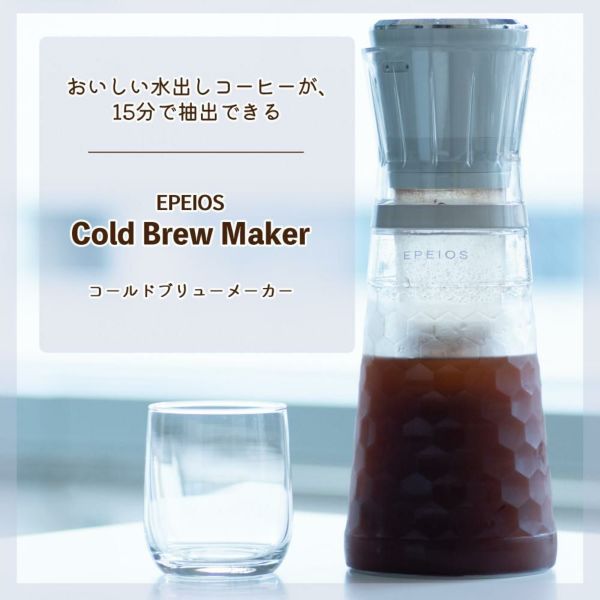 真空抽出技術を搭載したEPEIOSのコールドブリューメーカーは、水出しコーヒーがたったの15分で完成。