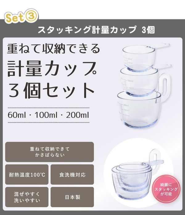 3)スタッキング計量カップ 3個入り (60ml・100ml・200ml) DH-8129
