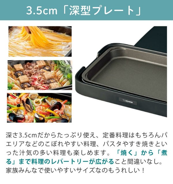 深さ3.5cmだからたっぷり使え、定番料理はもちろんパエリアなどのこぼれやすい料理、パスタやすき焼きといった汁気の多い料理も楽しめます。