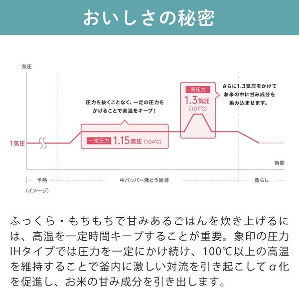象印の圧力IHタイプでは圧力を一定にかけ続け、100℃以上の高温を維持することで釜内に激しい対流を引き起こしてα化を促進し、お米の甘み成分を引き出します。