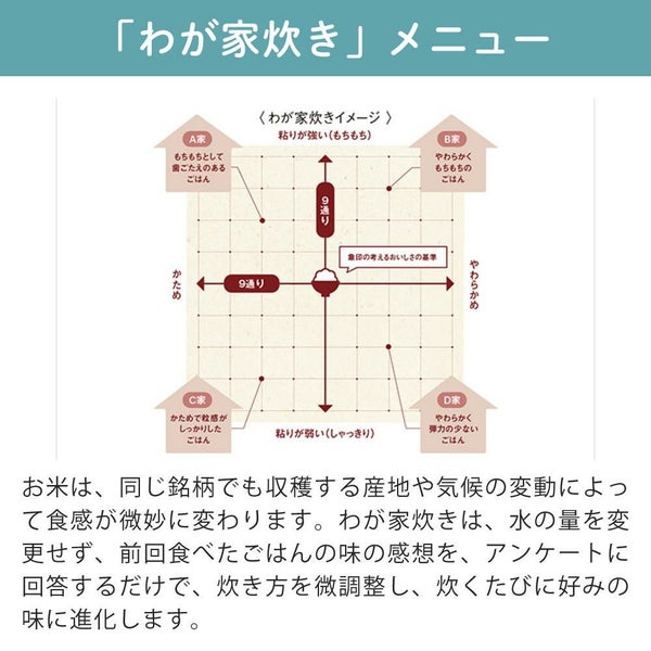 わが家炊きは、水の量を変更せず、前回食べたごはんの味の感想を、アンケートに回答するだけで、炊き方を微調整し、炊くたびに好みの味に進化します。