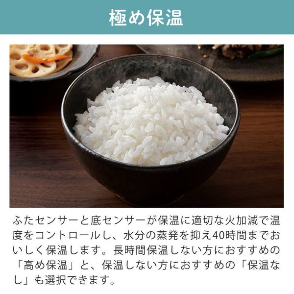 ふたセンサーと底センサーが保温に適切な火加減で温度をコントロールし、水分の蒸発を抑え40時間までおいしく保温します。