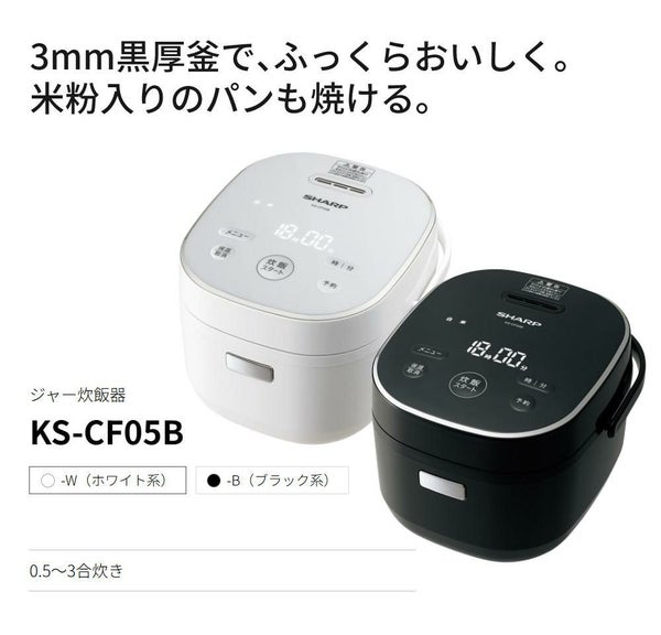 SHARP ( シャープ )の 炊飯ジャー KS-CF05B は、 ふっくらおいしく炊飯できる 黒厚釜 球面炊き 仕様。 健康を考える人にも嬉しい 玄米や 雑穀米に対応した 多彩な 炊飯メニューを楽しめます。一人暮らしや カップル 夫婦 友達同士 などの 少人数に適した 3合炊き。 ごはん だけでなく、シンプルな パンから 米粉入りの パンまで 焼ける 高機能モデルです。