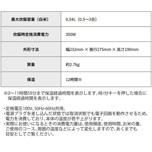 | 最大炊飯容量(白米) | 0.54L(0.5~3合) |