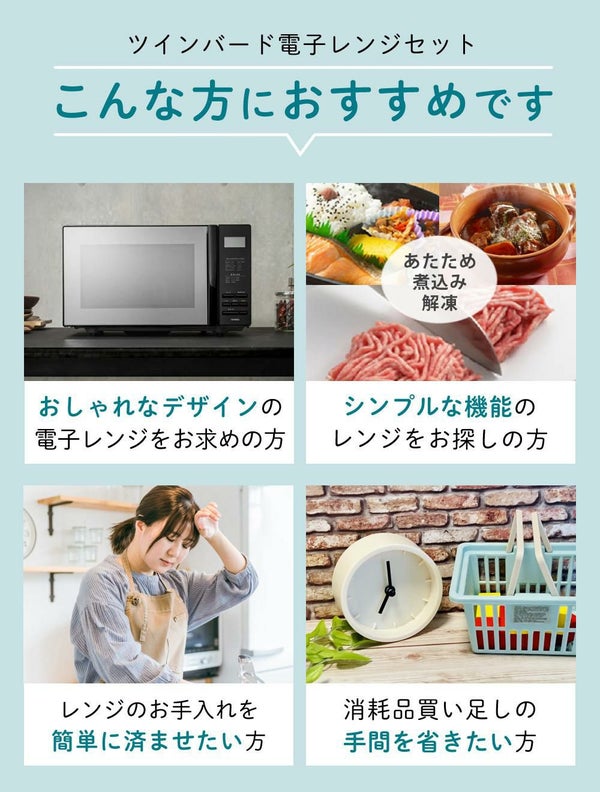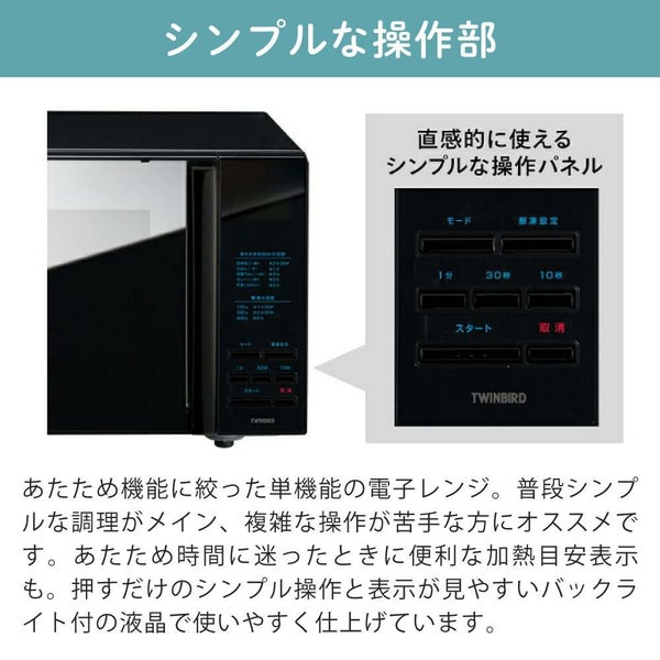 ツインバード ibistory ミラーガラスフラット電子レンジは、押すだけの簡単操作と見やすい液晶表示を備えた単機能タイプ。フラット構造でお手入れもしやすく、ブラックのミラーガラスデザインがキッチンを上質に演出します。