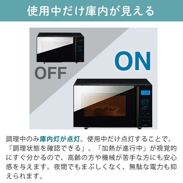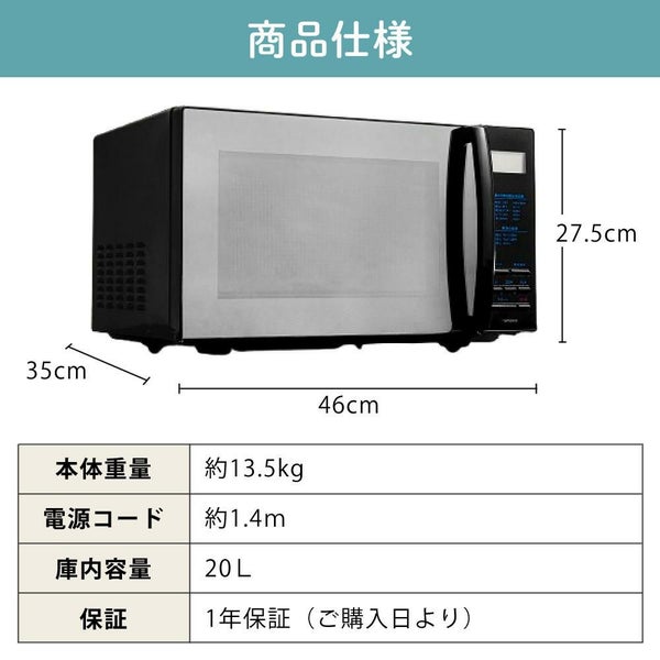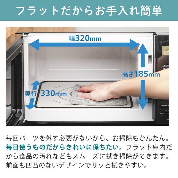 庫内容量は20L。お弁当や大皿もそのまま入る広い庫内で、ターンテーブルがないためフラット面の拭き掃除が簡単。電子レンジ フラットテーブルタイプとして、お手入れしやすさを実現しています。