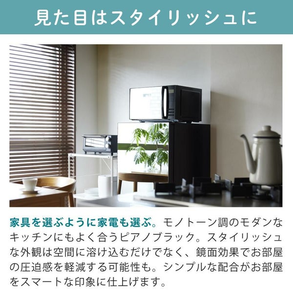 前面には上質なミラーガラスを採用。使用時には庫内灯が点灯し、印象が変化します。ブラックの本体カラーがキッチンをスタイリッシュに演出します。