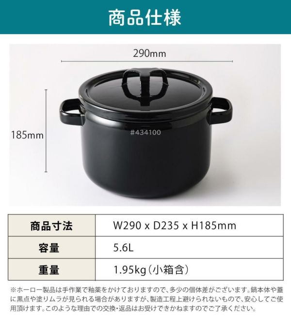 ※ホーロー製品は手作業で釉薬をかけておりますので、多少の個体差がございます。鍋本体や蓋に黒点や塗りムラが見られる場合がありますが、製造工程上避けられないもので、安心してご使用頂けます。このような理由での交換・返品はお受けできかねますのでご了承ください。