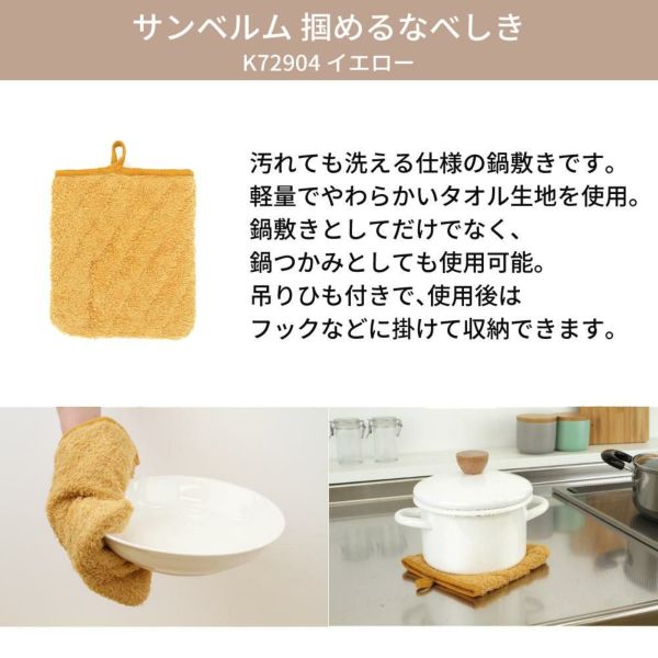 厚みのあるタオル地で熱からしっかりガードし、鍋敷きとしてはもちろん鍋つかみとしても使える便利アイテムです。