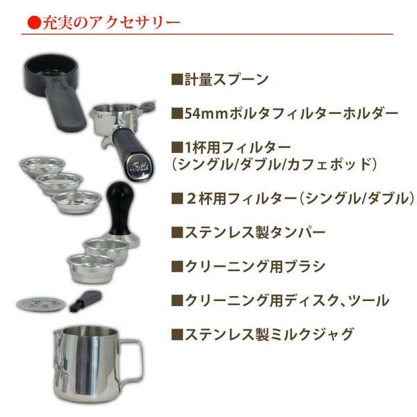 付属品・・・計量スプーン、54mmポルタフィルターホルダー、フィルター各種、ミルクジャグなど