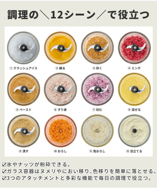 (1)ミンチ(2)ペースト(3)すり身(4)刻む(5)混ぜる(6)潰す(7)砕く(8)練る(9)クラッシュアイス(10)おろし(11)とろろ(12)泡立ての1台で12シーンで活躍。