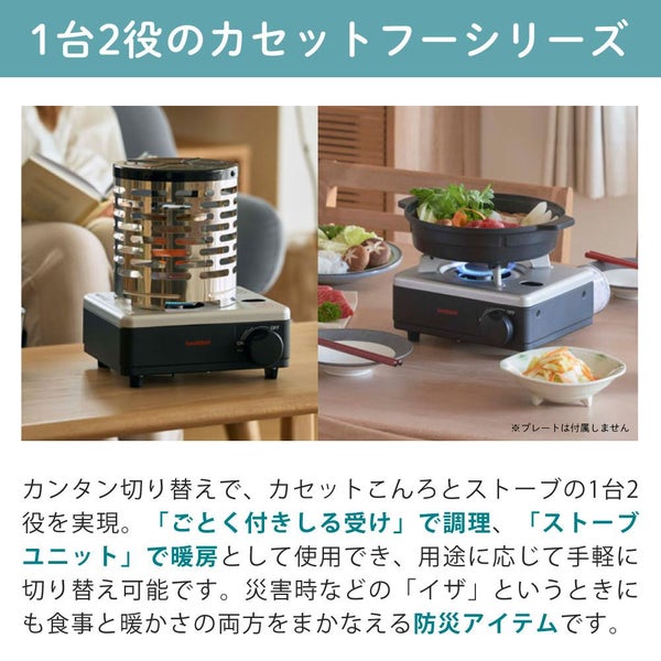 付属の「ストーブユニット」に交換すれば、遠赤外線効果で身体を温めるカセットガスストーブとして機能。リビングでのスポット暖房や、一人暮らしのお部屋などにおすすめです