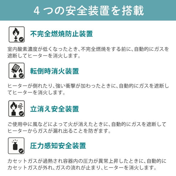 | 連続燃焼時間 | 約2時間25分 ※気温20~25℃のとき、強火連続燃焼にてカセットボンベ1本を使い切るまでの実測値 |