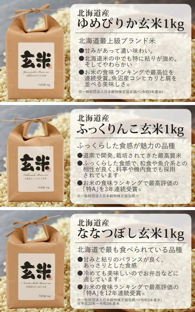 | 2)北海道産玄米3種セット(ゆめぴりか・ふっくりんこ・ななつぼし) 1kg×3種 |