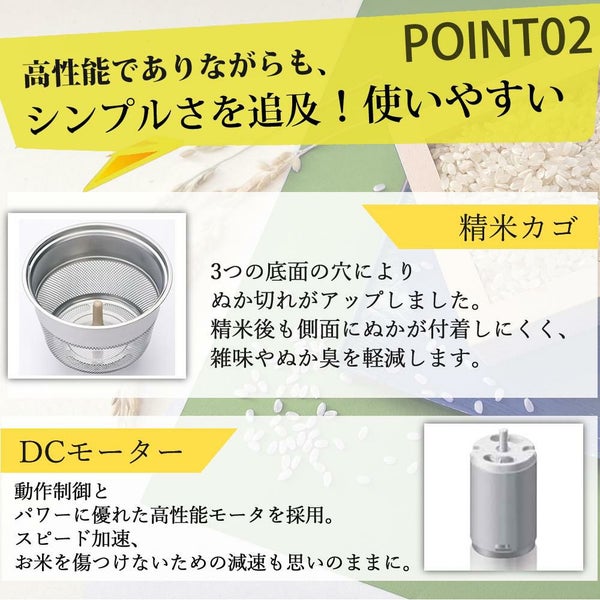 動作制御とパワーに優れた高性能モーターを採用。スピードのための加速、お米を傷つけないための減速を実現。