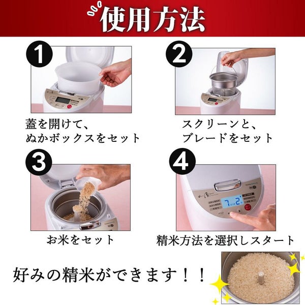 本体:ABS、カバー:ABS、米ぬかBOX:PP、スクリーン:SUS、ブレード:SUS/PP、カバーパッキン:PP/シリコン、オープナー:ABS |