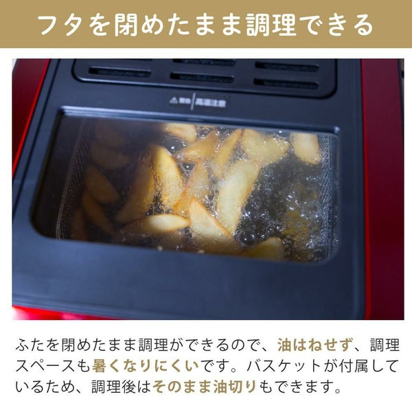 フタを閉めたまま調理できるので、油はねもせず、調理スペースも暑くなりにくい。調理後はそのまま油切りもできる。