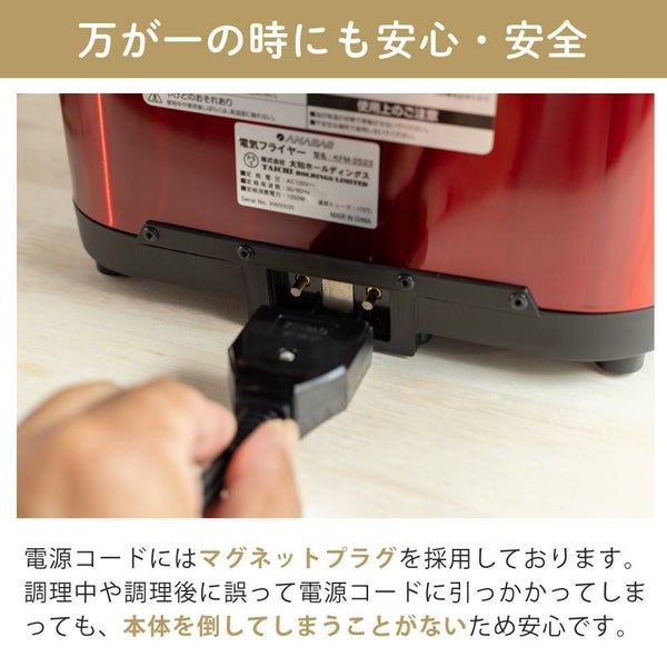 調理中や調理後に誤って電源コードに引っかかってしまっても、コードが抜けるため本体を倒してしまうことがなく安心して使用できる。