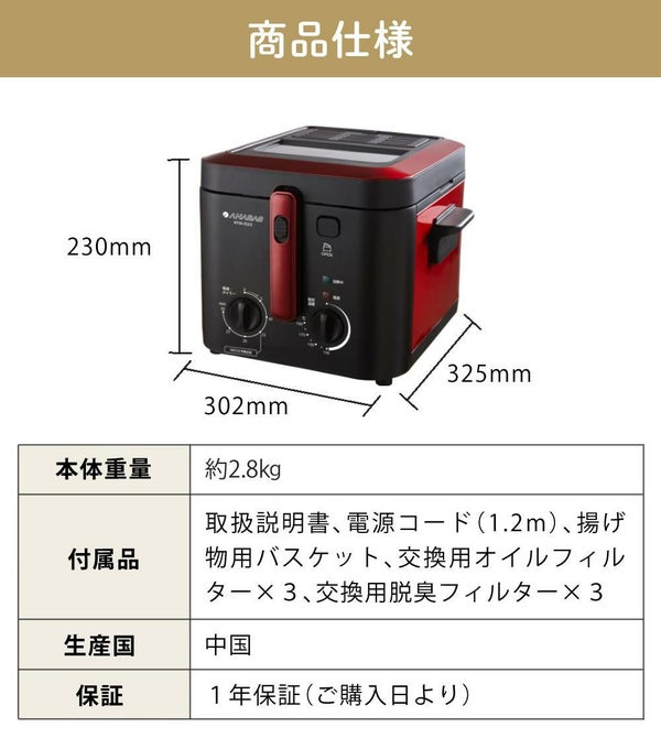 | 付属品 | 取扱説明書、電源コード(1.2m)、揚げ物用バスケット、交換用オイルフィルター×3、交換用脱臭フィルター×3 |