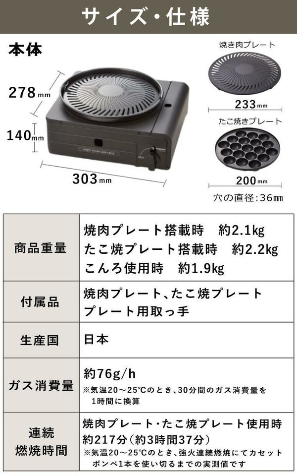 ※本製品は焼肉調理に合わせ設計されており、通常のカセットこんろに比べ発熱量を抑えています。