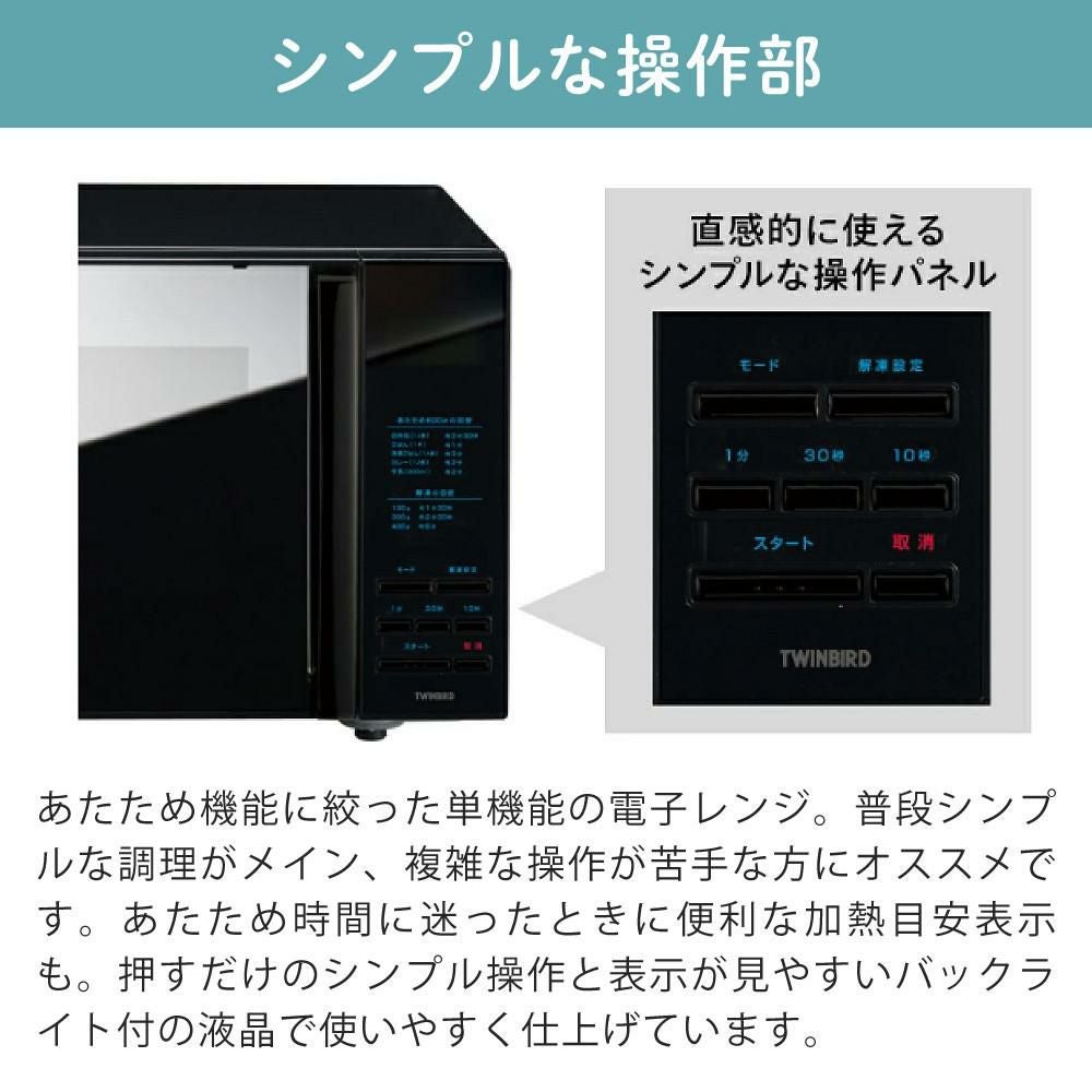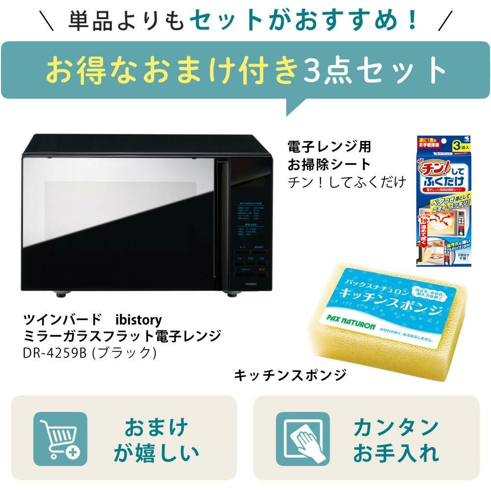 他の画像を見る フラット庫内でお手入れしやすい単機能電子レンジ。押すだけのシンプル操作と見やすい液晶表示、ブラックデザインが魅力。 ツインバード 電子レンジ ibistory ミラーガラスフラット電子レンジ DR-4259B 3点セット(ラッピング不可)(熨斗対応不可) 販売価格 ¥ 16,800 税込 カートに入れる お気に入りに登録する (0件)