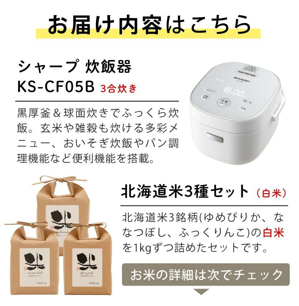 他の画像を見る シャープ 炊飯器 3合炊き KS-CF05B 北海道米3種付き SHARP 炊飯ジャー お米 玄米 雑穀米 パン 一人暮らし(ラッピング不可/熨斗対応不可) 販売価格 ¥ 13,680 税込 在庫切れ カートに入れる お気に入りに登録する (0件)