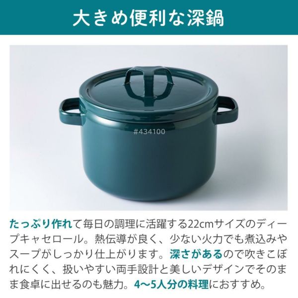 たっぷり作れて毎日の調理に活躍する22cmサイズのディープキャセロール。熱伝導が良く、少ない火力でも煮込みやスープがしっかり仕上がります。深さがあるので吹きこぼれにくく、扱いやすい両手設計と美しいデザインでそのまま食卓に出せるのも魅力。4~5人分の料理におすすめ。