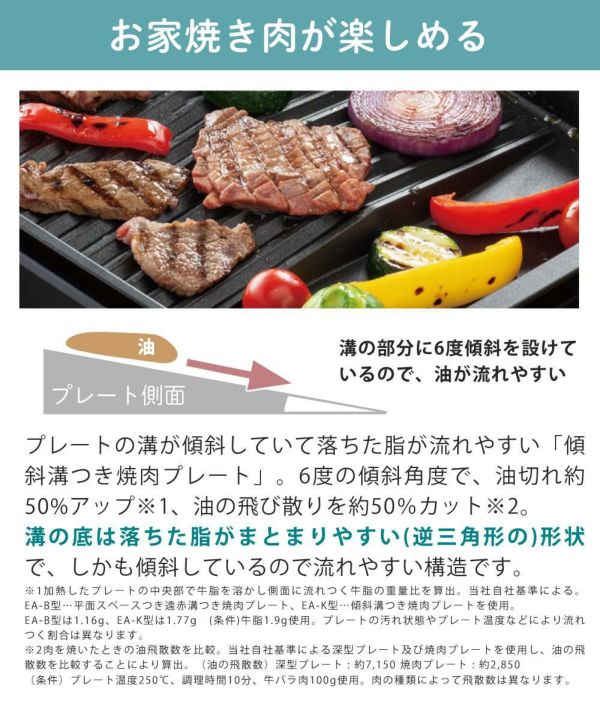 EA-B型…平面スペースつき遠赤溝つき焼肉プレート、EA-K型…傾斜溝つき焼肉プレートを使用。