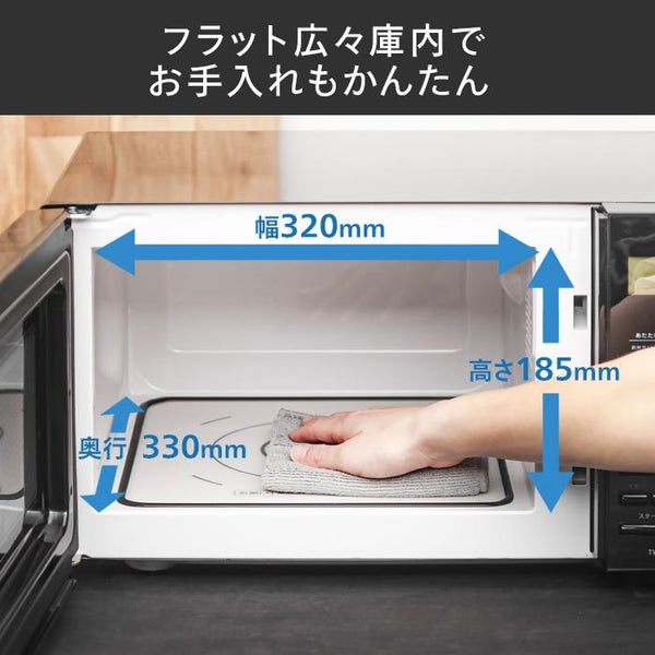 シンプルなボタン操作と表示が見やすいバックライト付の液晶で使いやすいフラット電子レンジです。