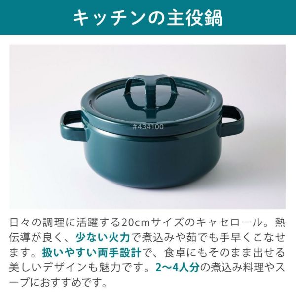 日々の調理に活躍する20cmサイズのキャセロール。熱伝導が良く、少ない火力で煮込みや茹でも手早くこなせます。扱いやすい両手設計で、食卓にもそのまま出せる美しいデザインも魅力です。2~4人分の煮込み料理やスープにおすすめです。