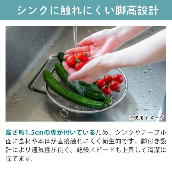 高さ約1.5cmの脚付きで、下に食器や食材がつかず衛生的。通気性も上がるため乾きも早い。