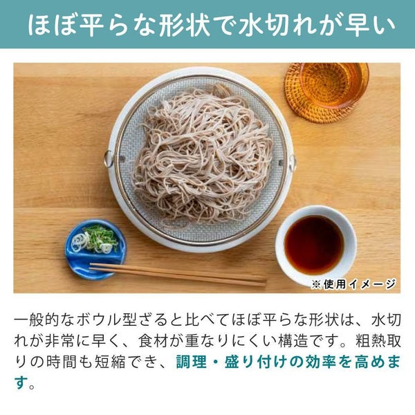 ボウル型のざると比べ、ほぼ平らで食材が重なりにくく、水切れが早いのが魅力。粗熱取りの時間短縮にも◎