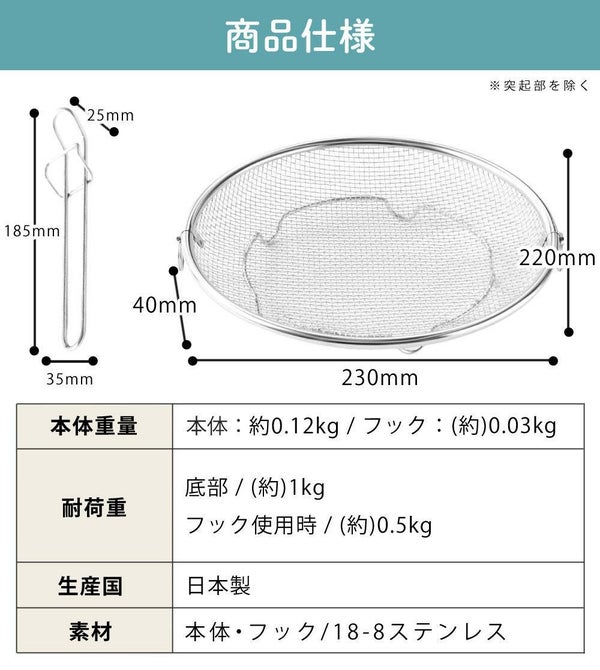 持ち上げ用のフック付きなので熱くなった盆ざるも安心して取り出せます。