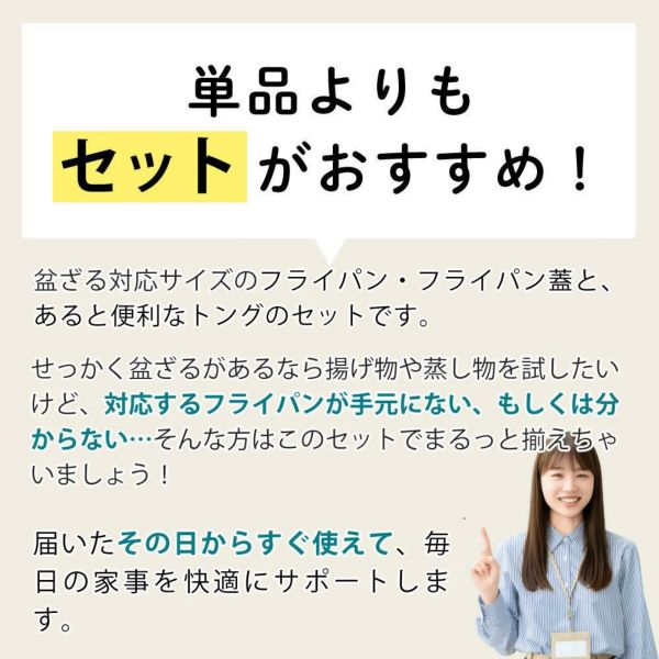 取っ手のない盆ざるはフライパンや鍋に入れやすく、蒸し料理にも最適。「すっきり暮らす盆ざる22cm」は26cmフライパンに入ります。※形状によって入らない場合もございます。