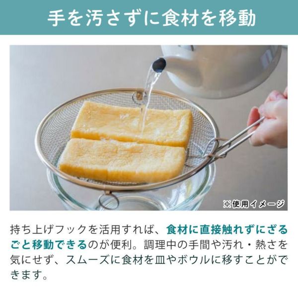 持ち上げフックを使えば、食材に触れずにざるごと移動できるので便利。