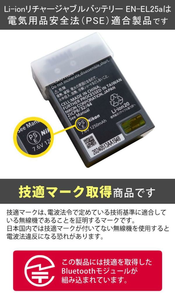 | 使用電池 | Li-ionリチャージャブルバッテリー EN-EL25a※ 1個使用 ※ EN-EL25aの代わりにEN-EL25も使えます。ただし、EN-EL25aを使用したときよりも撮影可能コマ数(電池寿命)が減少します。 |