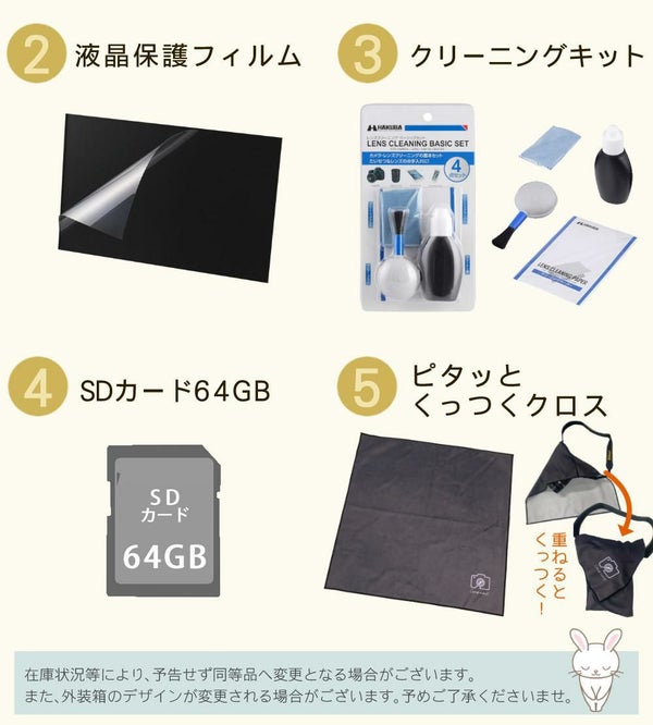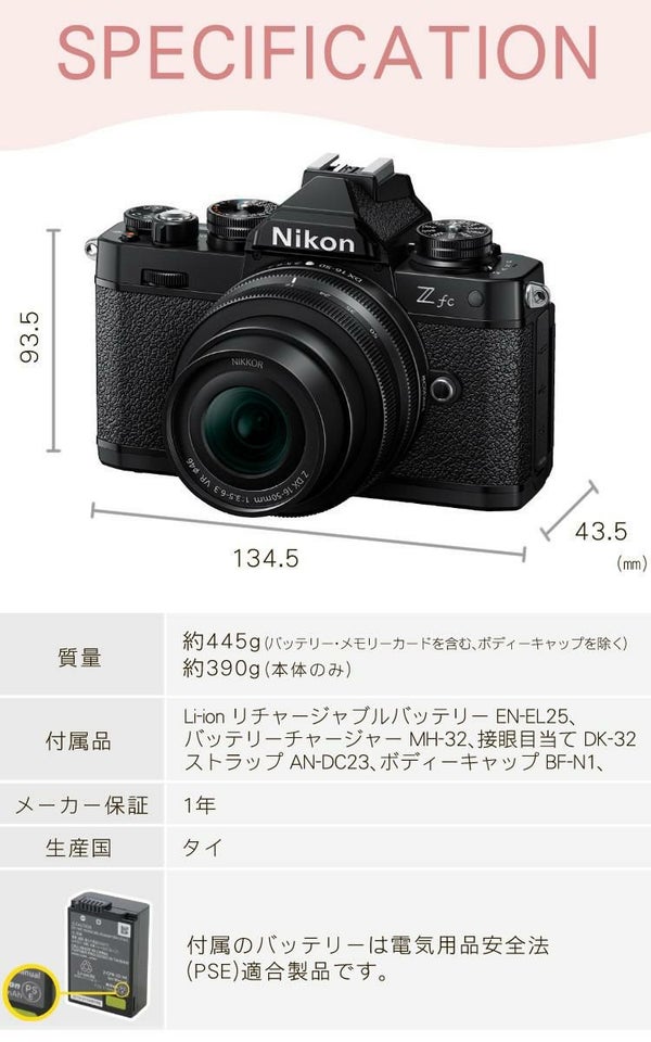 付属品 Li-ion リチャージャブルバッテリー EN-EL25、バッテリーチャージャー MH-32、ストラップ AN-DC23、ボディーキャップ BF-N1、接眼目当て DK-32
