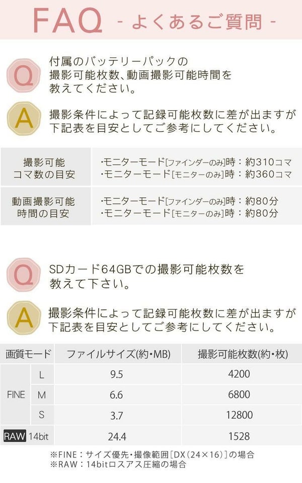 ・JPEG:JPEG-Baseline準拠、圧縮率(約):FINE(1/4)、NORMAL(1/8)、BASIC(1/16)