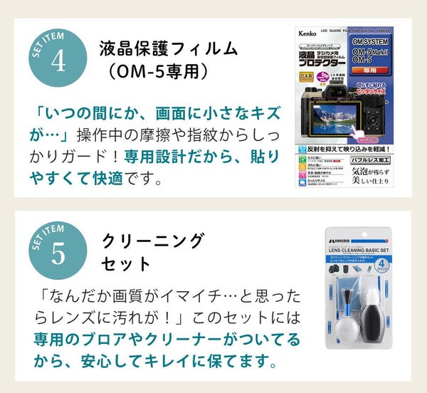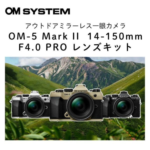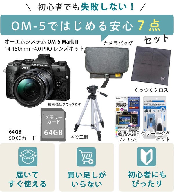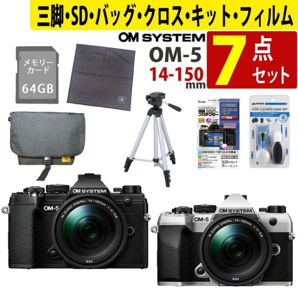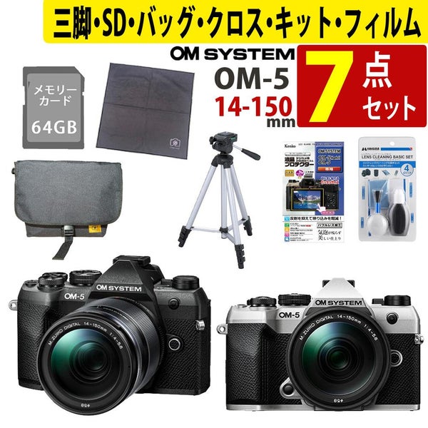 アウトドア撮影や登山 キャンプ 旅カメラ に最適な軽量ミラーレス オーエムシステム OM-5 Mark II 14-150mm レンズキット(カラー選択式) SD64GB クリーニングキット クロス フィルム 三脚 バッグ セット(ラッピング不可)