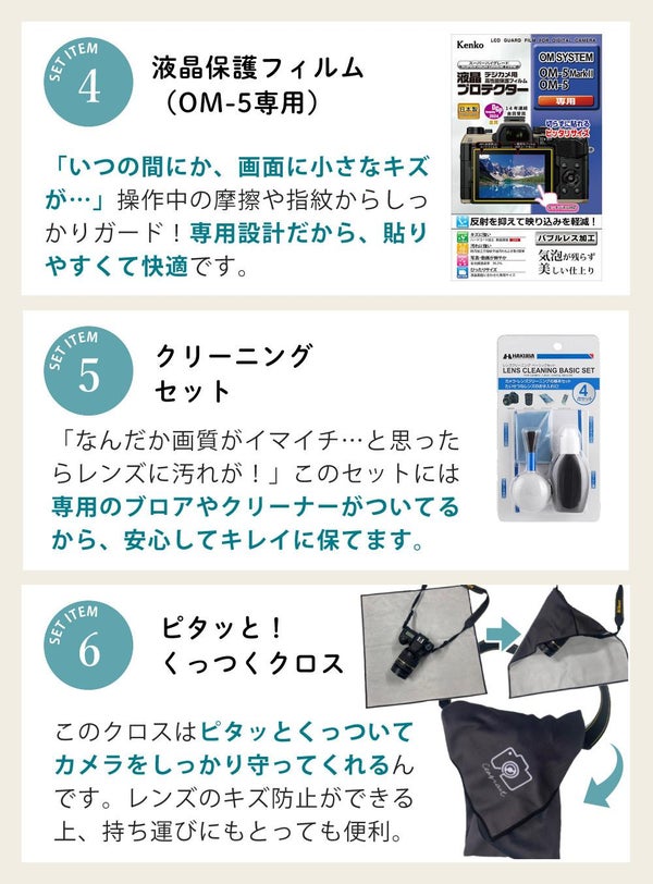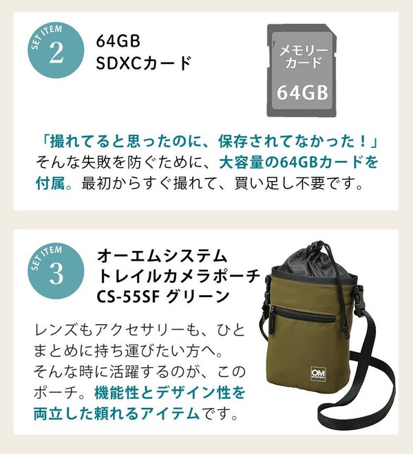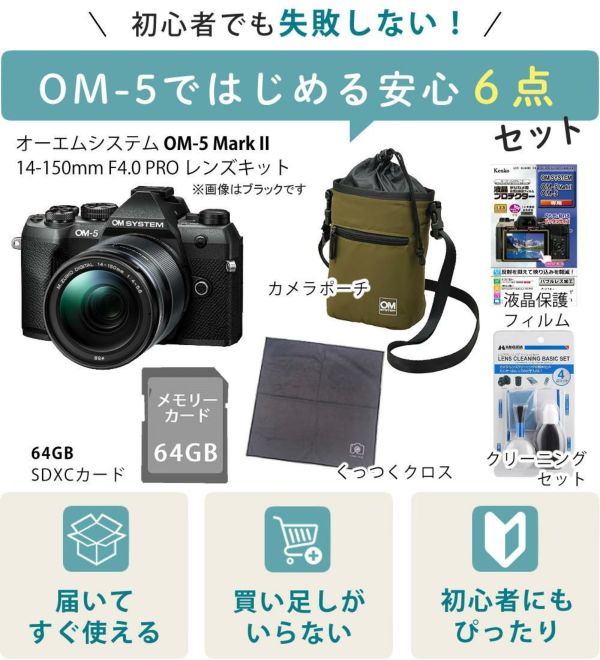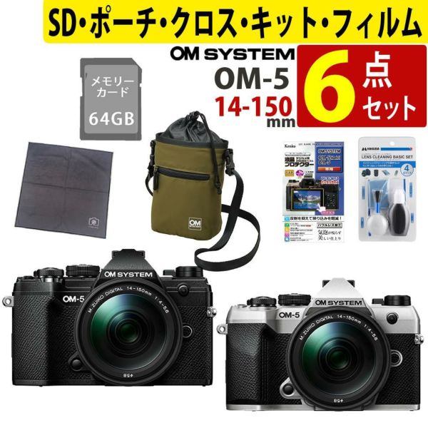 アウトドア撮影や登山 キャンプ 旅カメラ に最適な軽量ミラーレス オーエムシステム OM-5 Mark II 14-150mm レンズキット(カラー選択式) SD64GB クリーニングキット マルチクロス フィルム ポーチ セット(ラッピング不可)