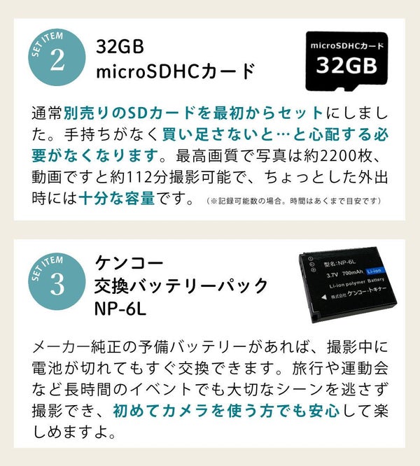 【付属品】リチウムイオン充電池、ストラップ、USBケーブル(Type-A to microUSB)、取扱説明書 |