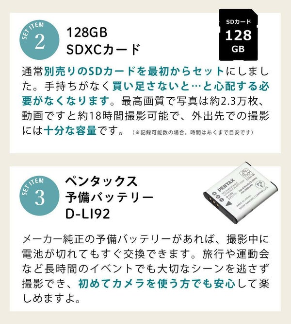 リチウムイオンバッテリー D-LI 92、ACアダプターキットK-AC117J(別売) |
