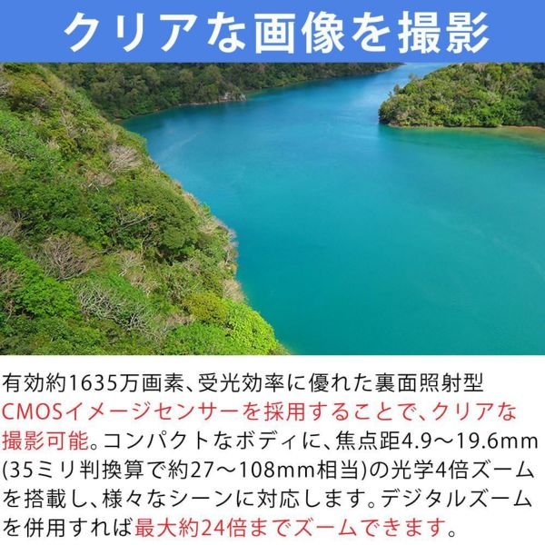 35ミリ判換算で約27?108mm相当の光学4倍ズームを搭載、さらにマクロ機能を使うことで最短5cmまで接写が可能。自動でシーンを判別し最適なモードで撮影する「AUTO」やISO感度を自分で選択できる「マニュアル」、水中で自然な色合いで撮影できる「水中」等、7つの撮影モードを搭載。またフルHDサイズでの動画撮影機能や連写撮影にも対応し様々なシーンで活躍。
