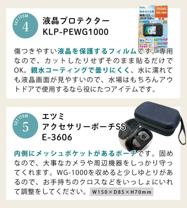 電池や充電器、USBケーブルの他、カメラ本体をキズや汚れから守る「プロテクタージャケット」、ベルトやバッグに引っ掛けて使える「カラビナストラップ」など、アウトドアで使いやすいアクセサリーを同梱。