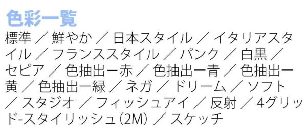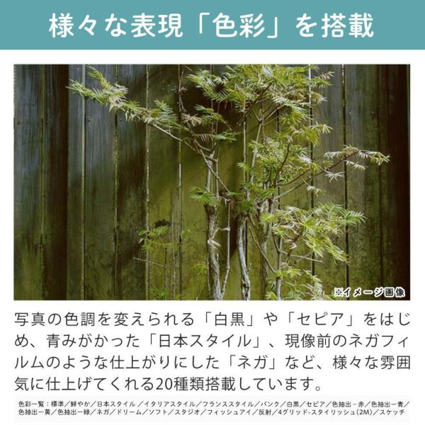 写真の色調を変えられる「白黒」や「セピア」、青みがかった「日本スタイル」、緑がかった「イタリアスタイル」、赤みがかった「フランススタイル」と、現像前のネガフィルムのような仕上がりにした「ネガ」、絵画のような仕上げになる「スケッチ」のように特殊加工を施すものなど、様々な雰囲気に仕上げてくれる20種類の「色彩」を搭載し、PCやスマートフォンがなくても多彩な色表現が可能。