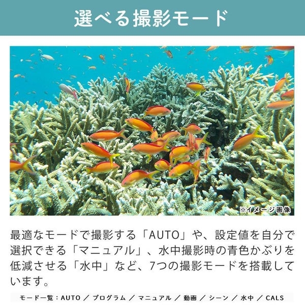 35ミリ判換算で約27?108mm相当の光学4倍ズームを搭載、さらにマクロ機能を使うことで最短5cmまで接写が可能。自動でシーンを判別し最適なモードで撮影する「AUTO」やISO感度を自分で選択できる「マニュアル」、水中で自然な色合いで撮影できる「水中」等、7つの撮影モードを搭載。またフルHDサイズでの動画撮影機能や連写撮影にも対応し様々なシーンで活躍。