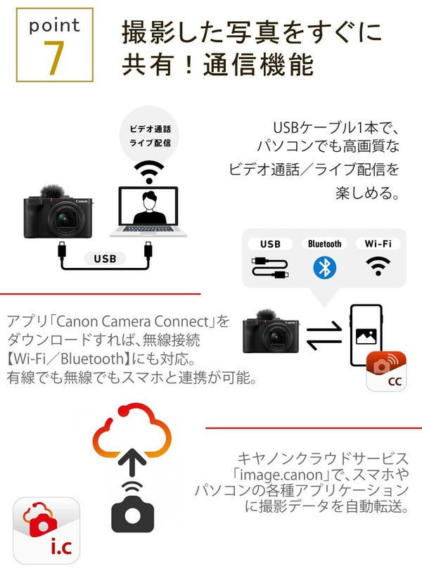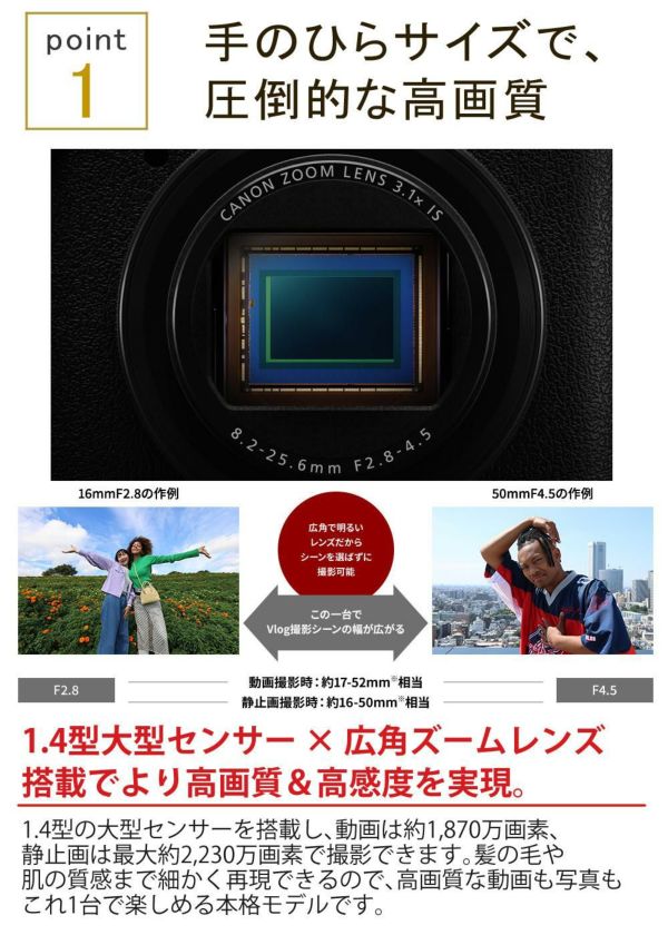 キヤノン PowerShot V1 は、 2230万画素 の 1.4型大型センサー を搭載し、 高画質・高感度 撮影が可能な コンパクトデジタルカメラ です。 VLOGカメラ としても最適で、 4K動画撮影 や 手ブレ補正 機能を備え、クリアな映像を実現。 Wi-Fi対応 で スマホ連携 も簡単、SNS投稿や YouTube などの 動画配信 にも最適。旅行や日常の撮影に活躍する 軽量・小型 モデルです。