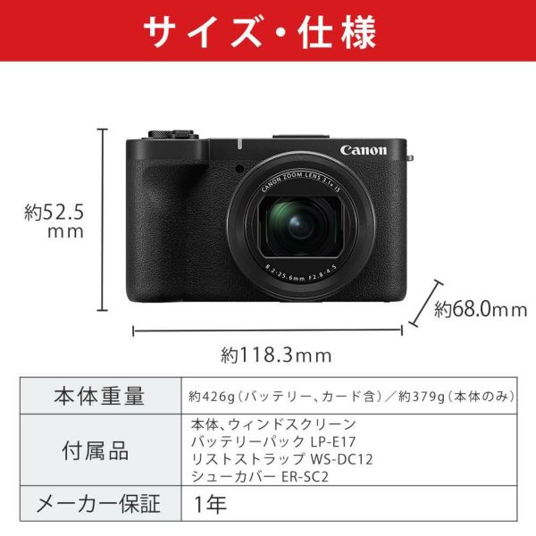 | 付属品 | ウィンドスクリーン、バッテリーパック LP-E17、リストストラップ WS-DC12、シューカバー ER-SC2 ※バッテリーチャージャー、インターフェースケーブル、ACアダプターは同梱されていません |