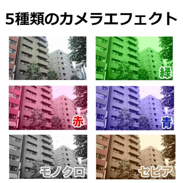 | カメラエフェクト | 赤 / 緑 / 青 / 紫 / モノクロ |